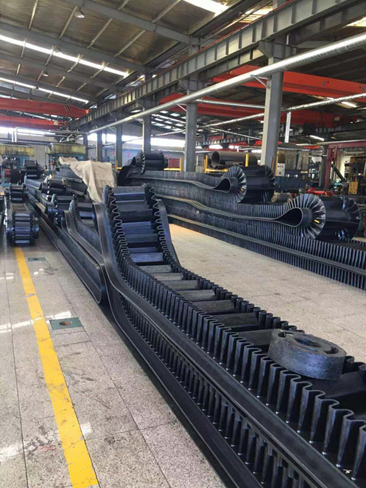 大傾角輸送帶要求具有一定的抗拉強(qiáng)度和耐磨性。其中對(duì)留有空邊的大傾角輸送帶,為了適應(yīng)角度改向的要求,膠帶的縱向要求有柔軟性,橫向則要求有一定的剛性。公司生產(chǎn)的波狀擋邊輸送帶采用特殊結(jié)構(gòu)的橫向剛性基帶,解決了大規(guī)格輸送帶在回程過程中塌帶現(xiàn)象。